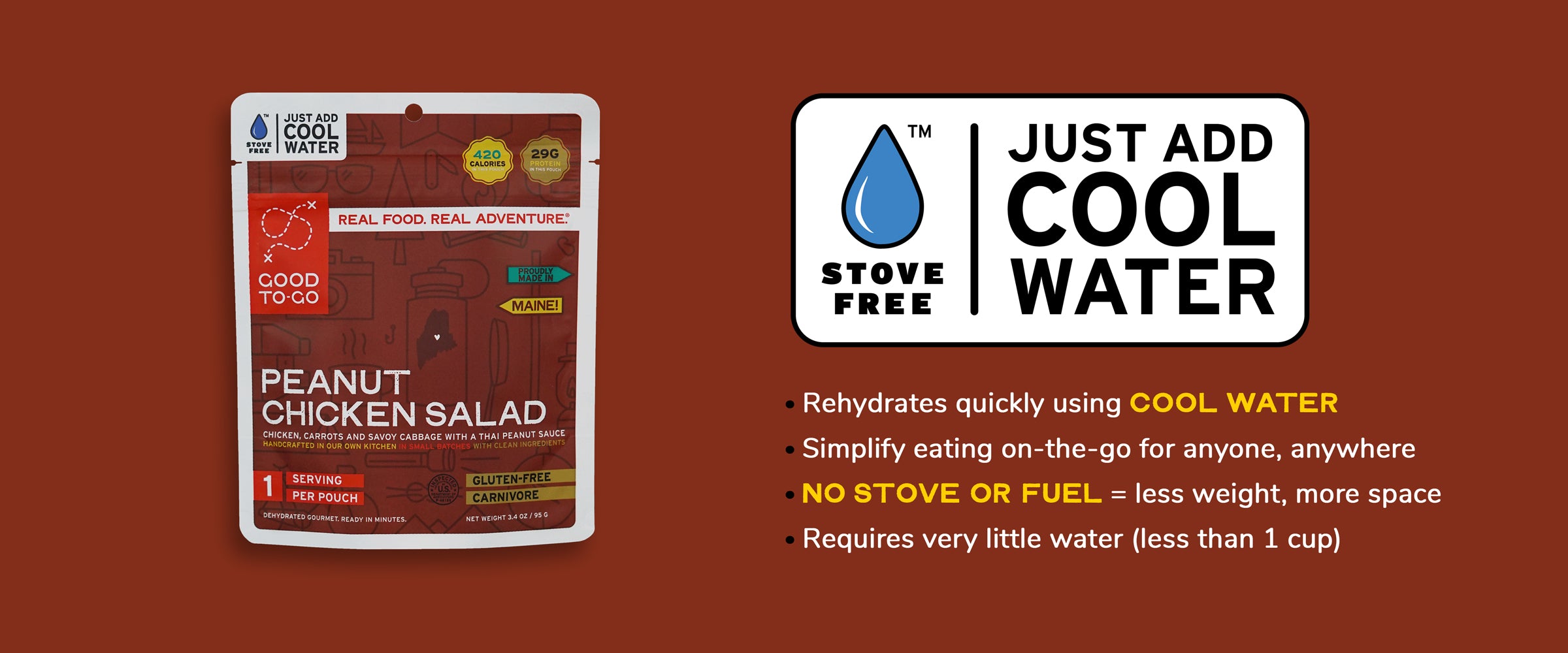 I was skeptical when I saw "add cold water". I thought "Yeah but, I'm sure it's better with hot water". Well, I went with the cold water recommendation, and it was amazing! What an amazing meal. Given I was staying at some AMC huts on a backpacking trip, this allowed me to pack some "light lunches" without the weight of a fuel canister and stove. I say light lunch, but I can't overlook the 29 grams of protein! This is a filling meal, and only requires a small amount of water. (half a cup). Many people complain that backpacker meals aren't very flavorful, but this one i just incredible! If you like Thai meals, you will love this!