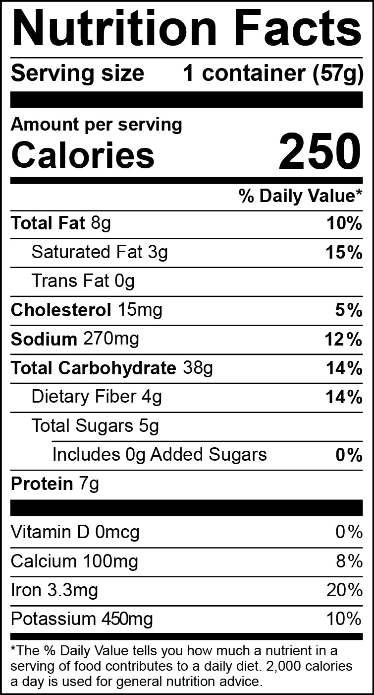 Cuban food to go? You bet. Big, bold flavors with a balanced spice take this rice bowl to new heights. The combination of rice and beans creates a complete protein—providing you with the all the amino acids you need to go that extra mile. While this meal is vegetarian, even the hungriest of carnivores will appreciate the 7g of protein in every serving. Garlic crema sauce and plantains create unique flavors you’ll find in no other "instant" meal.