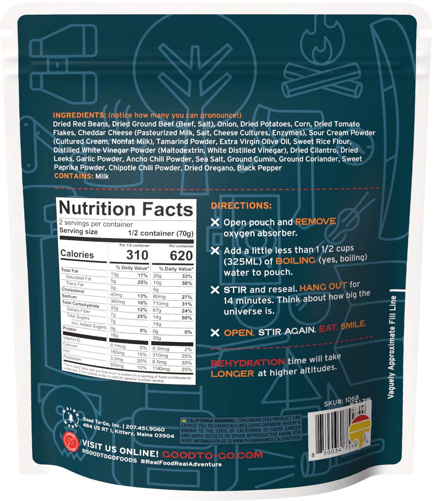 Dried Red Beans, Ground Beef (Beef, Salt), Onion, Dried Grated Potatoes, Corn, Dried Tomato Flakes, Chedder Cheese (Pasteurized Milk, Salt, Cheese Cultures, Enzymes), Sour Cream Powder (Cultured Cream, Nonfat Milk), Tamarind Powder, Extra Virgin Olive Oil, Sweet Rice Flour, Distilled White Vinegar Powder (Maltodextrin, White Distilled Vinegar), Dried Cilantro, Dried Leeks, Garlic Powder, Ancho Chili Powder, Sea Salt, Ground Cumin, Ground Coriander, Sweet Paprika Powder, Chipotle Chili Powder, Dried Oregano, Black Pepper